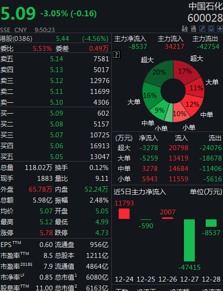 12月28日开盘,中国石化A股下跌3.81%,H股低开5.3%。截至发稿,中国石化A股跌3.05%,H股跌4.21%。公司昨晚公告,了解到联合石化在某些原油交易过程中因油价下跌产生部分损失,公司正在评估具体情况。