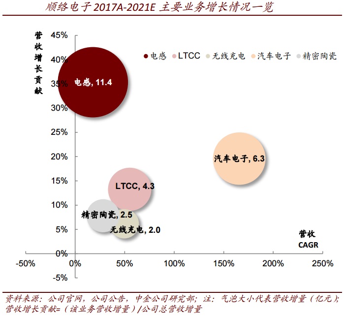 此外,公司沿叠层、绕线两大技术路线积极拓展业务。汽车电子变压器成功通过国内外知名汽车电子及整车大厂认证,开始放量;精密陶瓷产业平台构建完成,陶瓷结构件及器件有望获得增长;广泛布局无线充电产业链各环节,受益无线充电渗透趋势。中金公司预计至2021年汽车电子、精密陶瓷、无线充电将合计贡献收入增量的34%。
