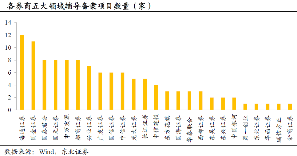 2018年IPO审核通过项目中科创板目标领域项目数量和募集资金排名靠前的券商为华泰证券和广发证券。另外,科创板首批试点企业极有可能从券商IPO辅导备案项目中挑选,这些公司已经发展到相对成熟阶段。对上市券商的IPO辅导项目进行筛选,海通证券、国金证券相关领域储备项目数分别为12家和11家,排名行业前两位。结合2018年前三季度各券商投行业务收入情况,综合考虑投行业务能力、项目储备情况和证券承销业务收入占比,头部券商将在科创板正式落地后迎来相对较大业绩增量。