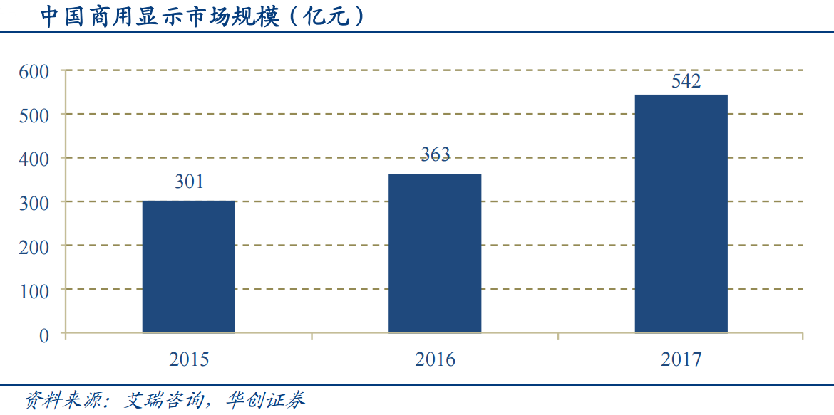 华创证券指出,目前小间距LED对LCD和DLP拼接墙的替代率刚刚接近20%,主要应用领域依然在监控、调度、指挥、会议、传媒等专用显示领域,但是商用领域的机场、商业购物中心、学校教育等市场已经开始采用小间距LED播放各类信息,各种LED新技术的应用将加速小间距在商用领域的渗透。2018年中国商用显示市场规模预计达700亿,小间距在商业领域应用不足30亿,未来具备较大增长空间。
