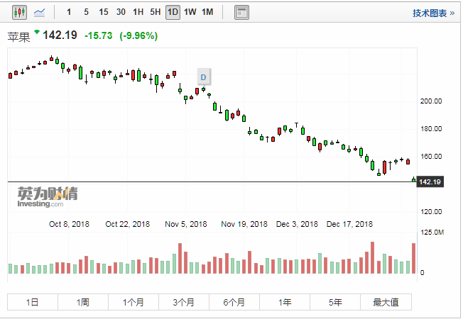 周四,苹果大跌近10%,创六年来最大单日跌幅,市值蒸发746.45亿美元。自去年10月触及每股233.47美元最高股价以来,至今苹果股价已下跌39%。仅仅三个月,苹果的市值就缩水4500亿美元。