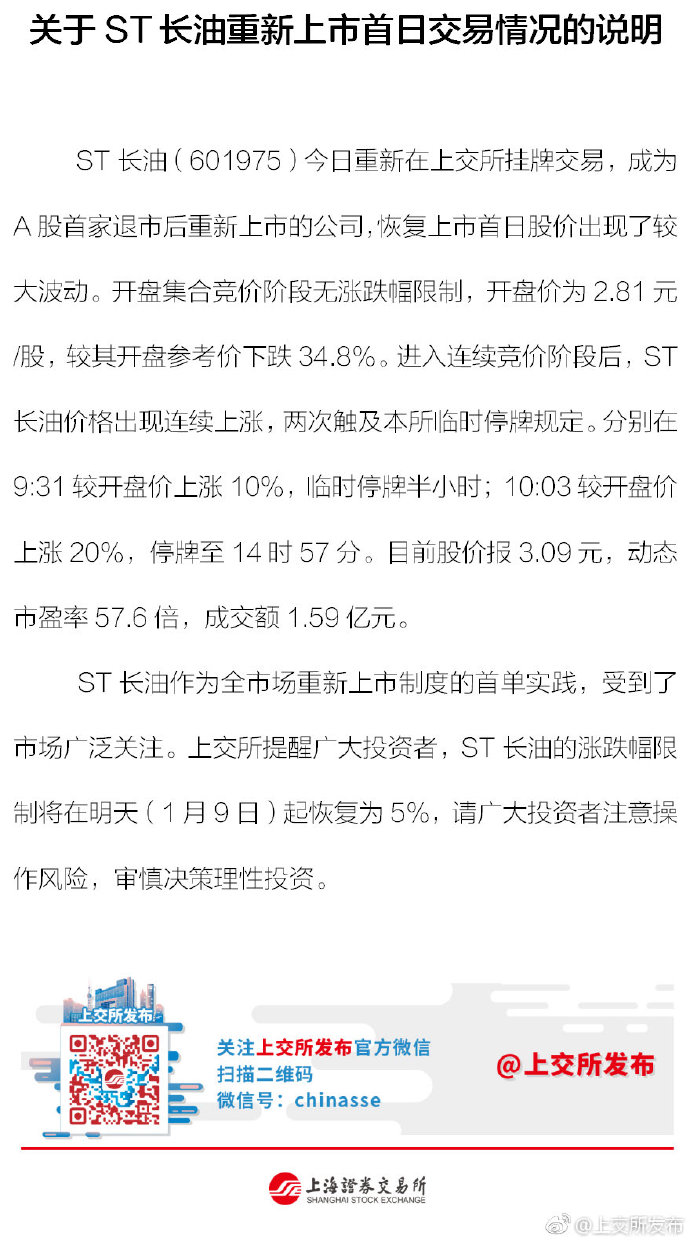 1月8日,四年多前退市的ST长油(601975)今日在上交所重新上市交易,开盘后即大跌34.8%。进入连续竞价阶段后,ST长油价格出现连续上涨,两次触及上交所临时停牌规定。