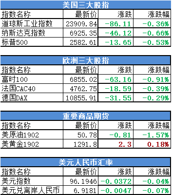 当地时间周一,美股全线收跌,标普500指数跌0.53%报2582.61点,纳斯达克指数跌0.94%报6905.92点,道琼斯指数跌0.36%报23909.84点。美国大型科技股收盘多数走低。欧洲主要股指也全线收跌,德国DAX指数收跌0.30%报10855.25点;英国富时100指数跌0.91%报6855.00点;法国CAC40指数跌0.39%报4762.75点。