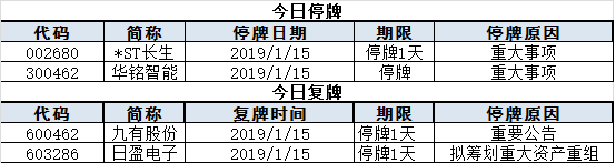 *ST长生公告,1月14日,公司收到深交所《关于对长生生物科技股份有限公司股票实施重大违法强制退市的决定》,公司股票于1月15日继续停牌一天,于1月16日起开始复牌,自复牌之日起,深交所将继续对公司股票交易实施退市风险警示,本次复牌后退市风险警示期为三十个交易日。公司股票三十个交易日后存在暂停上市风险。
