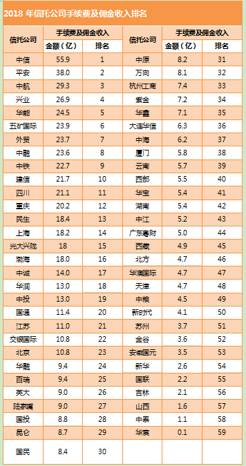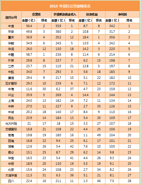 数据显示,老牌劲旅中信信托在2018年实现营业收入56.4亿元,手续费及佣金收入55.9亿元,净利润收入34.2亿元,位于行业第一。