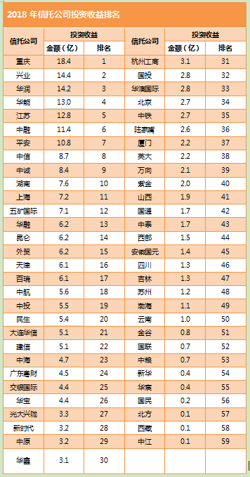 在2018年的投资收益榜单上,重庆信托以18.4亿元位居榜首。一直以来,重庆信托以繁多的金融股权投资而闻名业内。