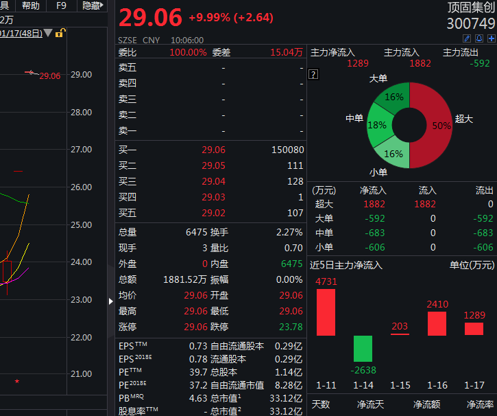 顶固集创17日再度涨停,截至发稿,该股报29.06元,换手率2.22%,成交额1881.5万元。这是该股连续第二个交易日涨停。