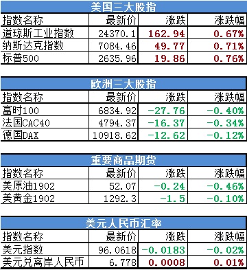隔夜欧美市场涨跌互现,美股收高,道琼斯指数涨0.67%报24370.10点,纳斯达克指数涨0.71%报7084.46点,标普500指数涨0.76%报2635.95点。摩根士丹利跌超4%,因业绩不及预期。欧洲市场上,三大股指集体收跌,德国DAX指数跌0.14%报10915.99点;英国富时100指数跌0.40%报6835.25点;法国CAC40指数跌0.34%报4794.37点。