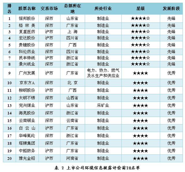 上市公司环境信息披露评价前20排名。资料来源:《中国上市公司环境责任信息披露评价报告(2017年)》