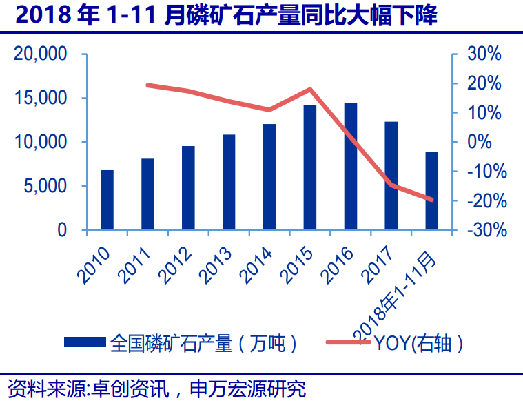 从原料端看,受政策性限采推动价格上涨,国内四大磷矿石主产区云贵鄂川均出台了限采或相关政策,2018年1-11月国内磷矿石累计产量同比下滑20%。申万宏源指出,磷矿石价值回归是磷化工产业链价格中枢上移的核心推手,预计国内磷矿石限采不会放松,价格仍有上涨空间。