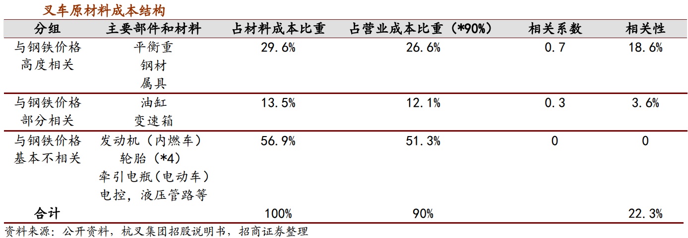 国内叉车行业历史毛利率较低,且由于钢材成本占比较高,受原材料价格波动影响大。通过详细拆分叉车公司成本结构,并通过对历史原材料价格波动、企业历史毛利率数据进行滞后回归实测分析,招商证券发现原材料价格与滞后3、6个月毛利率显著相关。这也与草根调研,企业原材料库存3~6个月的情况相符合。根据回测结果,若2019年原材料价格下降20%,则滞后两季叉车毛利率将增加1.2个百分点(理论测算结果更为明显)。这对于净利率在6%~8%徘徊的叉车企业来说,弹性较大。