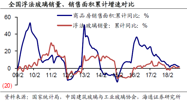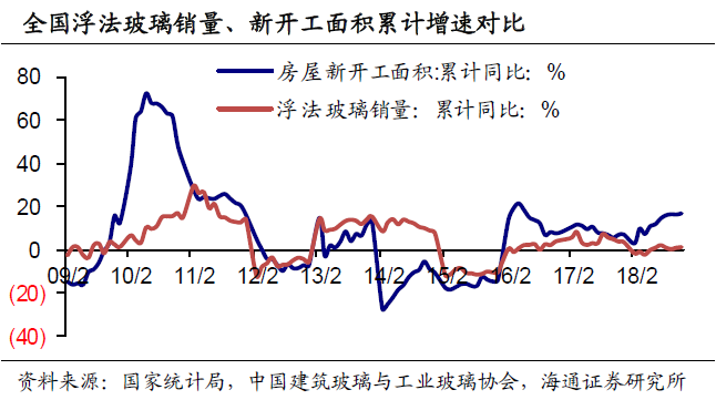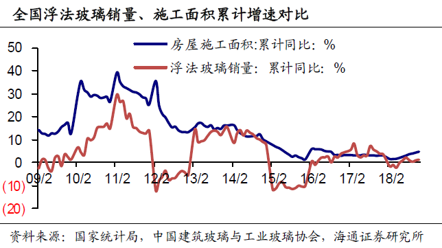 历史数据表明玻璃销量增速一般滞后于新开工面积增速半年至一年时间,而与施工面积增速较为同步。玻璃装修应用处于建筑物施工偏后环节,在房屋验收(竣工)之前,因此2018年高增长的新开工面积无法对玻璃需求形成拉动(剔除提前采购备货影响),同时玻璃集中安装的施工环节在2018年增速表现一般,导致2018年玻璃需求总体表现较为平淡。考虑到新开工面积增速领先玻璃需求半年至一年时间,海通证券认为2019年玻璃需求增速或因地产新开工向施工传导存在回升可能。