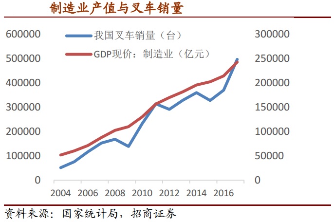 叉车销量与制造业投资高度相关,电商物流投资带动仓储叉车销售。叉车下游中,制造业和物流需求约2:1。招商证券通过历史数据发现,叉车与制造业产值及固定资产投资高度相关,预计叉车销量将随制造业投资增长而继续平稳增长。电子商务的普及带动快递量快速增长,驱动相应的自动化分拣、仓储、搬运设备投资。电动步行式叉车最受益于物流投资增加,预计2019年仍有50%增长。
