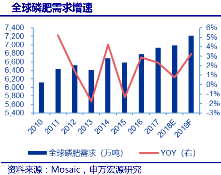 从磷肥端看,全球磷肥供需格局改善,国内磷肥产能继续缩减。据统计,国际磷肥2019~2020年新增产能增速不足2%,主要来自OCP和Ma'aden,而全球磷肥需求预计仍将保持平稳增长,增长主要来自于印度、巴西和非洲。2010~2017年全球磷肥需求CAGR约为1.8%,从6100万吨(实物量)增长至6940万吨,根据Mosaic预测2019年全球磷肥需求预计将达到7220万吨,同比增长3.29%,超过产能增速。而国内磷肥产能则受矿石供应紧张、磷石膏整治处理的环保趋严以及自身的供给侧改革将继续缩减。因此判断磷产业链景气将持续。