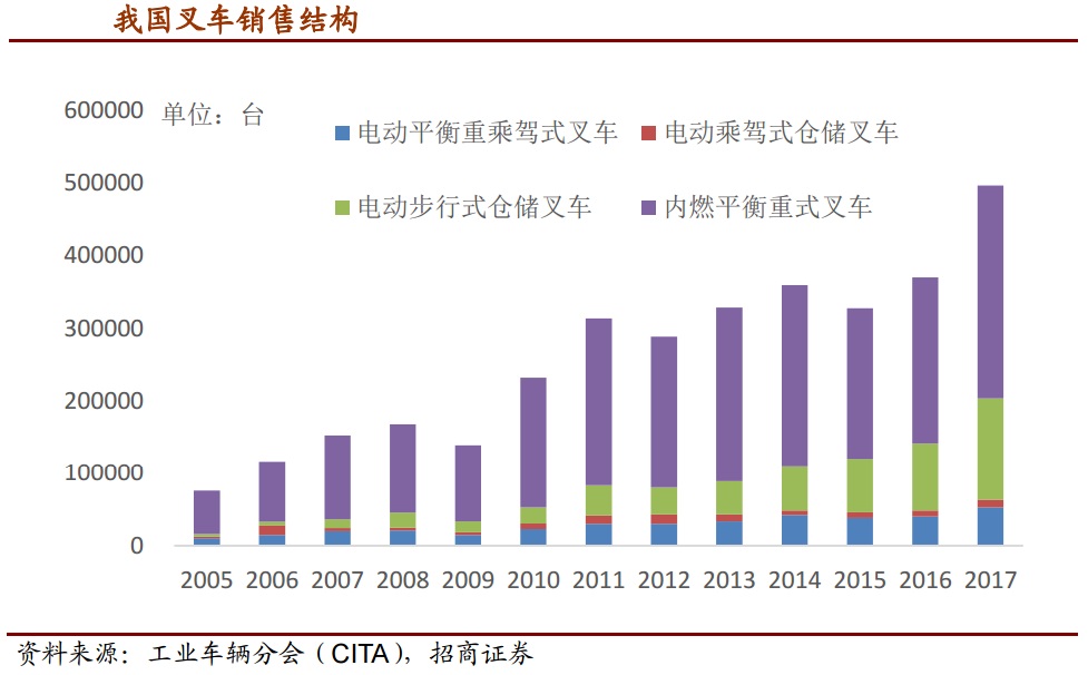 招商证券指出,叉车行业由于门槛较低、竞争环境激烈等原因,在A股机械公司中一直关注度较低,然而,叉车市场却是个不折不扣的大市场,2017年全球叉车销量133万台,年市场空间超千亿,是仅次于挖掘机的工程机械子行业。