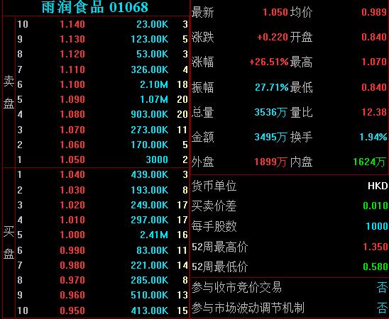 1月23日,雨润食品今日股价大涨,截至午间收盘,该股涨逾26%,报1.050港元,半年来首次股价升破1港元。