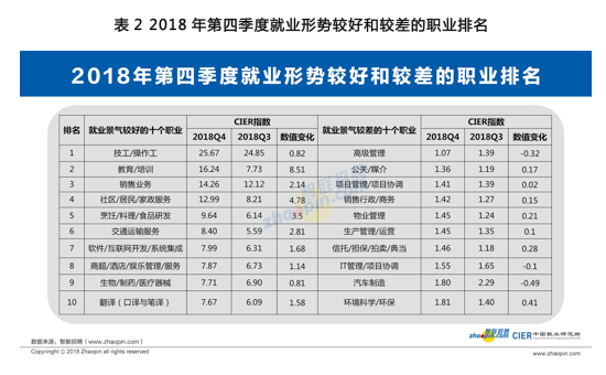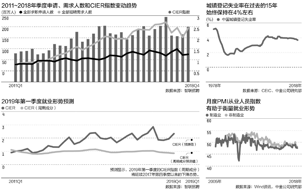 中国就业研究所联合智联招聘最新发布的2018年第四季度《中国就业景气指数报告》显示, 2018年四季度企业用工需求明显增加,环比增幅为25.42%,而求职申请人数环比仅增加3.90%,使得四季度中国就业景气指数(即CIER指数)上升至2.38, 就业景气度出现季节性回暖。