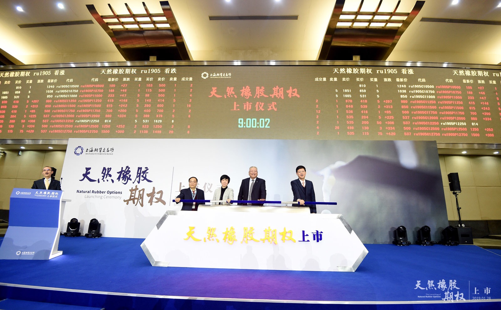 随着一声声倒计时,当日上午9时,天然橡胶期权合约正式挂牌交易。首日挂牌的天然橡胶期权合约标的期货合约为RU1905、RU1906、RU1907、RU1908、RU1909、RU1910、RU1911、RU2001。