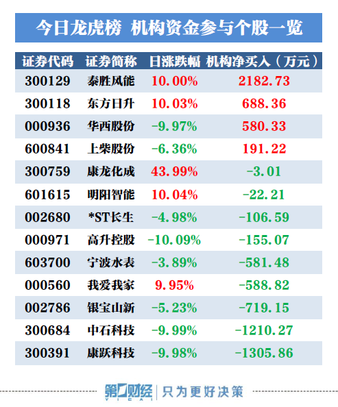 当天机构净买入前三的股票分别是泰胜风能、东方日升、华西股份,净买入金额分别为2183万元、688万元、580万元。