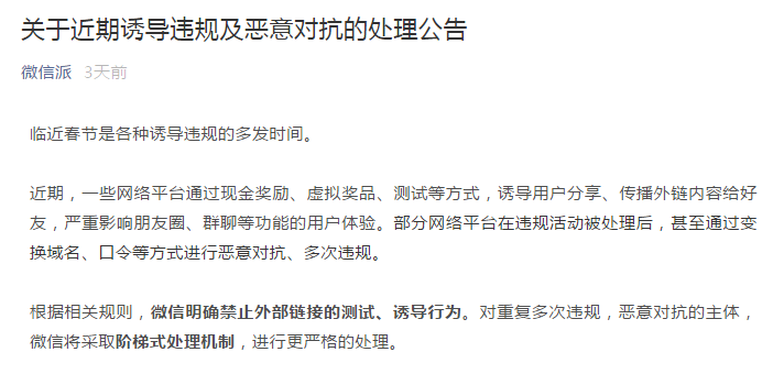此前,据微信派发布的《关于近期诱导违规及恶意对抗的处理公告》表示,近期,一些网络平台通过现金奖励、虚拟奖品、测试等方式,诱导用户分享、传播外链内容给好友,严重影响朋友圈、群聊等功能的用户体验。部分网络平台在违规活动被处理后,甚至通过变换域名、口令等方式进行恶意对抗、多次违规。