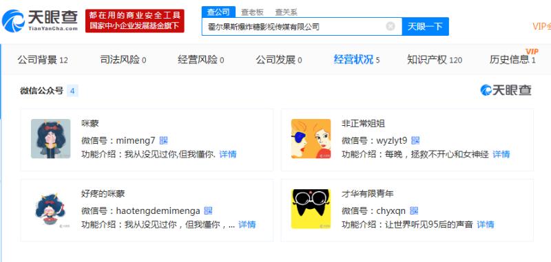 天眼查数据显示,咪蒙旗下共有4个微信公众号,运营主体均为霍尔果斯爆炸糖影视传媒有限公司,分别为:咪蒙、非正常姐姐、好疼的咪蒙、才华有限青年。