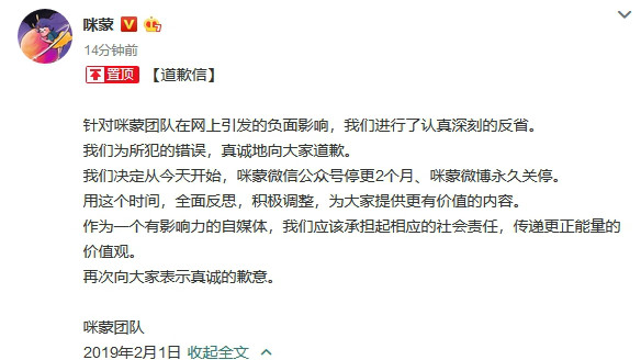 2月1日, 咪蒙团队在微博上发表道歉信, 称“针对咪蒙团队在网上引发的负面影响,我们进行了认真深刻的反省。我们为所犯的错误,真诚地向大家道歉。我们决定从今天开始,咪蒙微信公众号停更2个月、咪蒙微博永久关停。”