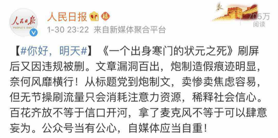 《人民日报》也于1月30日发布微博批评其“文章漏洞百出,炮制造假痕迹明显”。