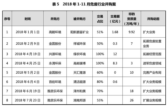 “高门槛、高利润、严监管、大缺口”的危废处理行业正在成为各路资本追逐的“香饽饽”。不完全统计结果显示,仅2018年全国危废行业兼并购数量就超过10起,资本的介入也加快了行业整合。