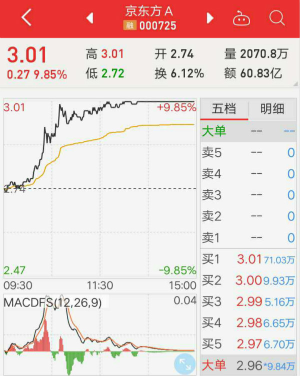 2月12日,京东方A放量涨停,收报3.01元,换手率6.12%,成交额60.83亿元。港股方面,京东方精电涨6.36%,报2.34港元。