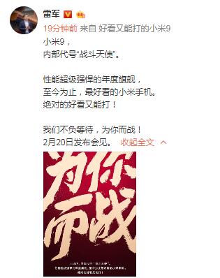 2月13日,小米集团宣布年度旗舰手机小米9将于2月20日正式发布。