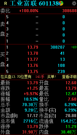 工业富联2月13日早盘强势拉升封上涨停,涨停板封单超过40万手,换手率6.29%,成交额超7亿元,是上市开板以来的首次涨停。截至发稿,工业富联涨9.97%,报13.79元/股。