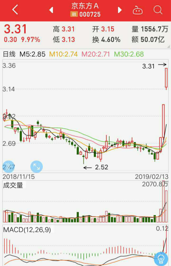 京东方A今日再度涨停,收报3.31元,换手率4.6%,成交额超50亿元。