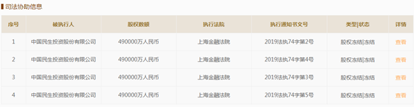 据中国国家企业信用公示系统,上海金融法院对中国民生投资股份有限公司所持的中民外滩房地产开发有限公司的股权解除冻结。