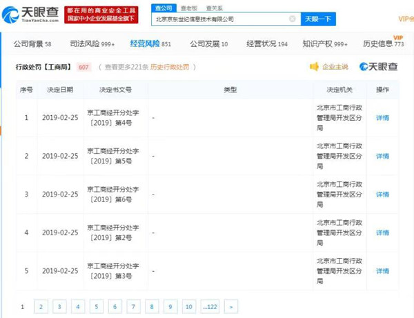 天眼查数据显示,2月25日,北京京东世纪信息技术有限公司新增5条行政处罚信息,共计罚款75万元,决定机关为北京市工商行政管理局开发区分局,处罚内容与类型未公示。