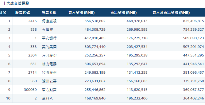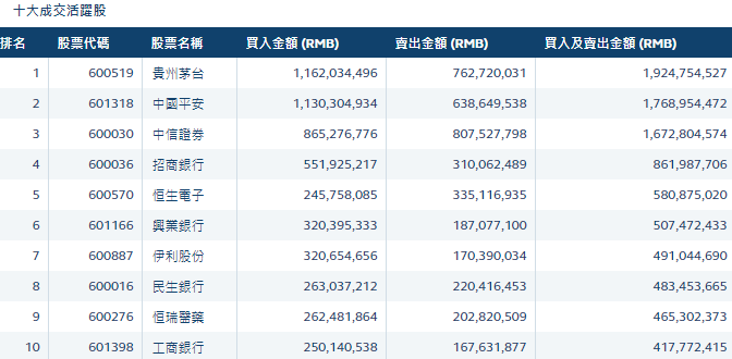 前20大成交股中,中国平安获净买入4.92亿元,贵州茅台净买入3.99亿元,招商银行、五粮液、平安银行均获超2亿元净买入,美的集团、格力电器、牧原股份、东方财富、兴业银行、伊利股份均获超1亿元净买入。而恒生电子、海康威视、万科A被沪股通净卖出。