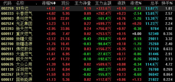 周五,国家能源局发布《关于促进生物天然气产业化发展的指导意见(征求意见稿)》,受此利好消息影响,燃气板块午前冲高,长春燃气、贵州燃气一度大涨5%,新疆浩源、佛燃股份跟涨。