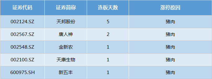 日内,猪肉概念股延续强势表现,天邦股份成功5连板,唐人神(002567.SZ)2连板,金新农(002548.SZ)、新五丰(600975.SH)、天康生物(002100.SZ)跟随涨停。