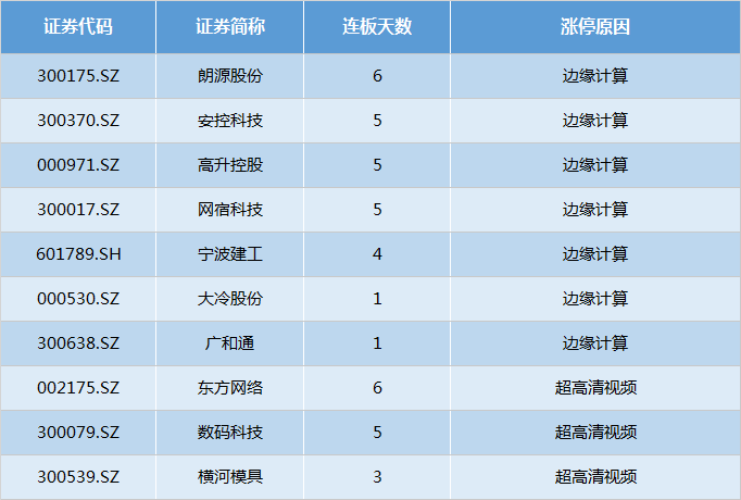 边缘计算、超高清视频概念股余热仍在,朗源股份、东方网络(002175.SZ)6连板,盘中一度打开涨停,数码科技(300079.SZ)、高升控股继续走一字板,与安控科技、网宿科技等集体斩获5连板。后排跟风股近全线回撤。