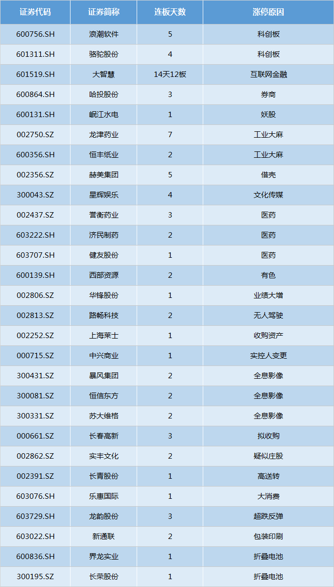 其余连板股主要为科创板、全息影像、工业大麻等概念以及部分医药股。值得一提的是,大金融板块仍有个股表现坚挺,互联网金融大智慧成功连板,哈投股份(600864.SH)3连板,前期强势股岷江水电(600131.SH)再度封板。