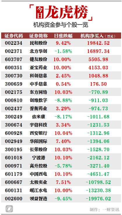 当天机构净买入前三的股票分别是民和股份、北方华创、健友股份,净买入金额分别为1.98亿元、1.69亿元、5506万元。