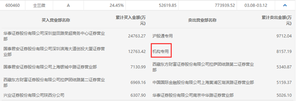 在卖出排行榜上,机构卖出最多的士兰微有1家机构卖出,净卖出金额8157万元。同时,沪股通卖出9712万元。
