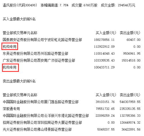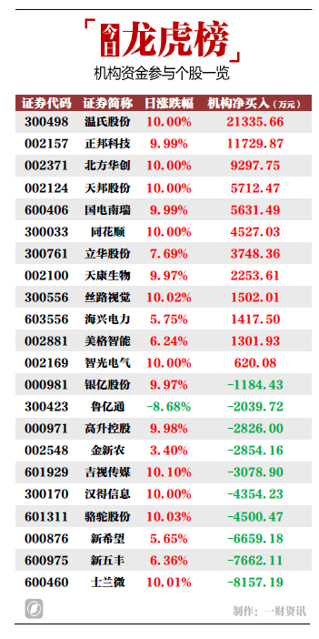 当天机构净买入前三的股票分别是温氏股份、正邦科技、北方华创,净买入金额分别为2.13亿元、1.17亿元、9298万元。