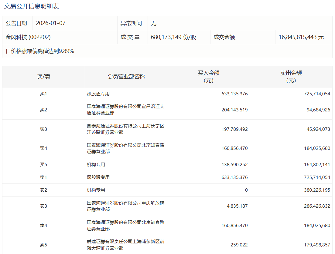 金风科技今日涨停,有2家机构专用席位净卖出4.06亿元
