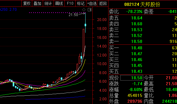 天邦股份12日涨停收报于20.24元/股,较2018年8月份的最低价4.03元/股,涨幅高达402%。