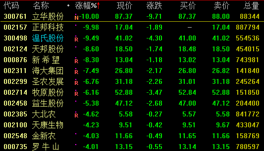 截至发稿,立华股份、正邦科技跌停,温氏股份、天邦科技、新希望均跌超8%,牧原股份、大北农、罗牛山等个股也下挫逾4%。