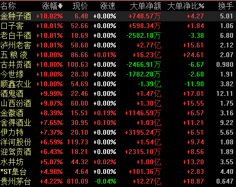 3月18日,白酒板块领涨两市,五粮液、泸州老窖、金种子酒、老白干酒、口子窖、顺鑫农业、古井贡酒、酒鬼酒等多只白酒股涨停,山西汾酒、金徽酒、珠江啤酒、舍得酒业、伊力特等涨幅超7%。
