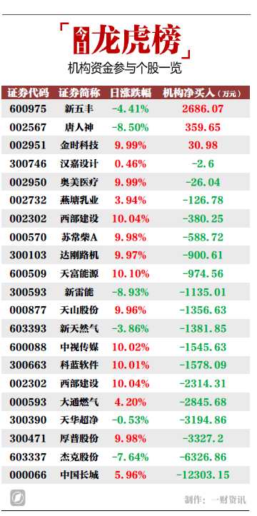 当天机构净买入前三的股票分别是新五丰、唐人神、金时科技,净买入金额分别为2686万元、359万元、31万元。