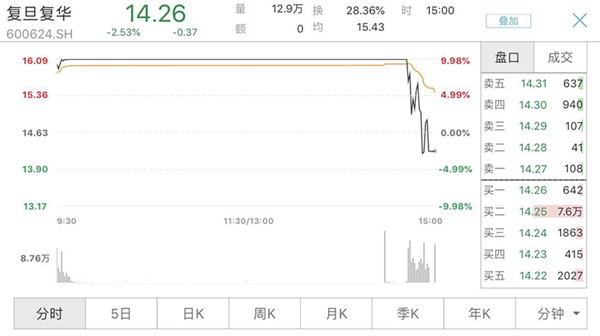 受此消息影响,已连续9个涨停板的复旦复华迅速开板,直线跳水,截至收盘,跌逾2%,报14.26元,换手率超28%。
