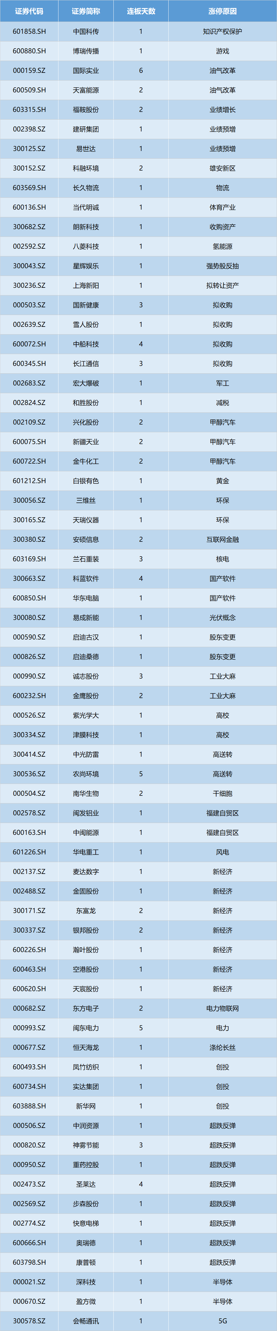个股方面,两市依然无一只非ST跌停个股,非ST个股涨停数为93只,短期市场延续走强的趋势,连板股超30只。受消息面影响,复旦复华尾盘跳水,连板失败。除此之外,国际实业(000159.SZ)、农尚环境(300536.SZ)、闽东电力(000993.SZ)、中船科技(600072.SH)、科蓝软件(300663.SZ)、中视传媒(600088.SH)、圣莱达(002473.SZ)等个股连续超过3日连板,主要分布在电力、国产软件、超高清视频板块。