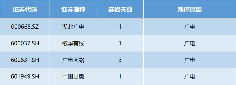 兼具娱乐和互联网属性的文化传媒板块今天集体走高,湖北广电(000665.SZ)、歌华有线(600037.SH)、广电网络(600831.SH)、中国出版(601949.SH)封涨停。